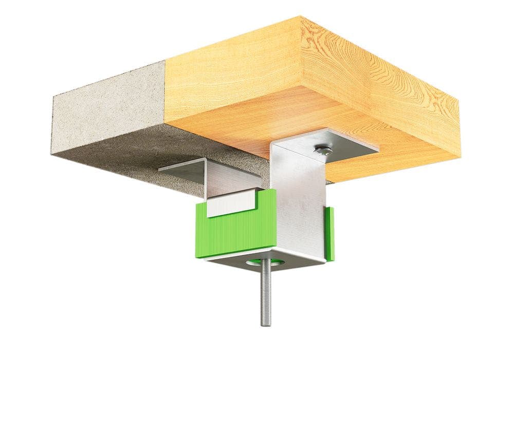 The EASYmount ceiling hanger is designed for acoustic decoupling of floating ceiling structures. Thanks to the integrated Sylomer® insert, transmission of contact noise and vibrations to the overhead structure is greatly reduced. Ideal for applications in commercial buildings, technical rooms, or other environments where sound transmission through ceilings needs to be minimised.